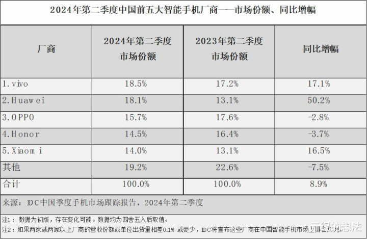 排名第四的是小米,它的出货量为1040万台,市场份额为15.2%,同比增长3.4%。作为横向对比,小米在2024年Q2榜单中排名第五,同比增长16.5%,是榜单中唯二实现同比增长的品牌(另一个是华为)。很多网友只看到了名次,没看到品牌出货量的趋势,这是小米被他们小看的主要原因。在其他厂商都同比下跌的情况下,小米能够做到持续逆势增长,亓纪只能说未来可期。